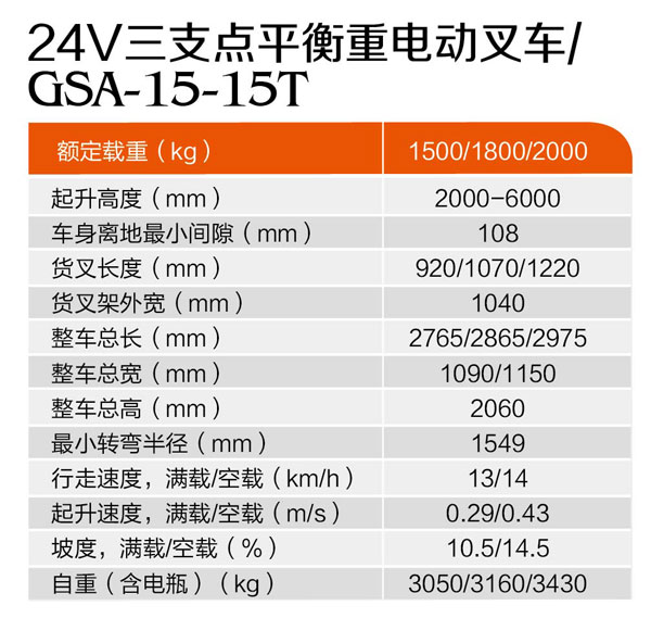 24V三支點平衡重電動叉車GSA-15-15T